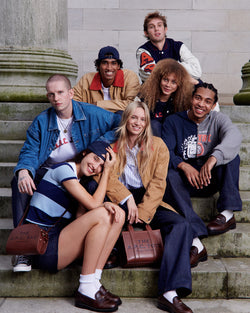 Orange accents appear throughout, on logos, a canvas jacket collar, and the stripes of a fleece polo, referencing Marc Jacobs’ 1980s Paris “Carte Orange” transit pass and Jean Touitou’s Sorbonne student card featured on a T-shirt. Roman Empire–style buttons bearing the designers’ profiles appear on jeans and penny loafers, blending heritage craftsmanship with playful design.