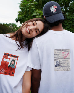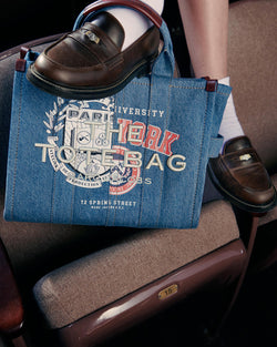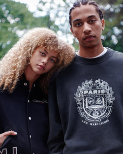 The collection unites two “universities” of style, with Marc Jacobs and A.P.C. crests featured on key pieces and signature embroidery and embossing appearing throughout, including a varsity jacket in wool and cowhide and dual-branded jerseys. Men’s and women’s essentials range from denim jeans (“THE JEAN”), miniskirts (“THE SKIRT”), and a slightly baggy striped shirt (“THE SHIRT”) to Marc Jacobs’ Tote Bag and a collector’s edition of A.P.C.’s Demi-Lune.